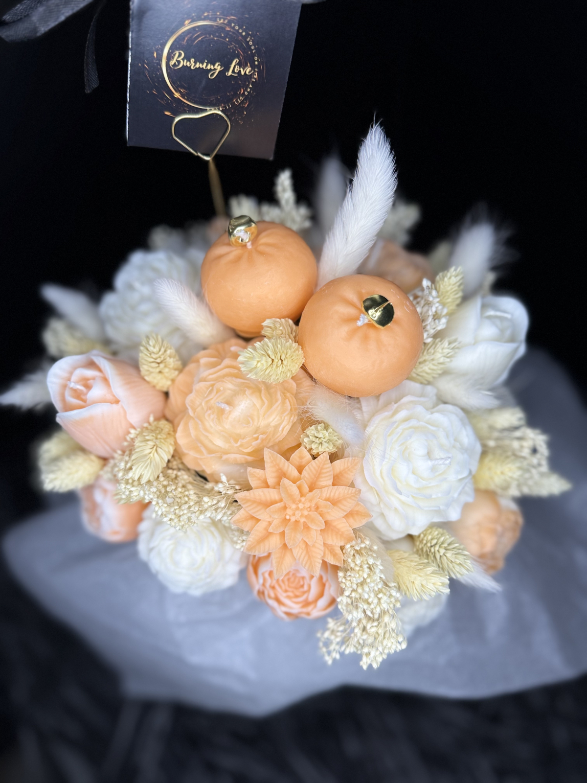 Acest buchet, realizat manual, combină bujori, flori delicate și accente de portocală, aducând farmecul și spiritul sărbătorilor în orice încăpere. Fiecare floare și fiecare element ornamental este aranjat cu atenție și grijă, pentru a transmite o amprentă emoțională deosebită. Notele portocalii evocă bucuria Crăciunului, momentele petrecute alături de familie și căldura cadourilor oferite celor dragi.